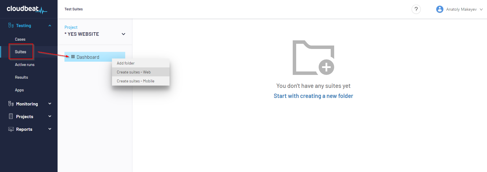 * Now after the folder is created, it appears on the left panel under the dashboard, right click it and select the type of test suite you wish to create - web or mobile